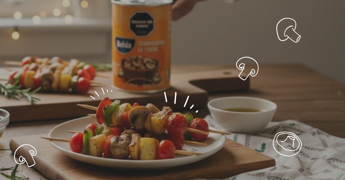Armá las brochetas alternando champiñones, tomates rojos y amarillos, y trozos de cebolla hasta completar las cuatro varillas.
