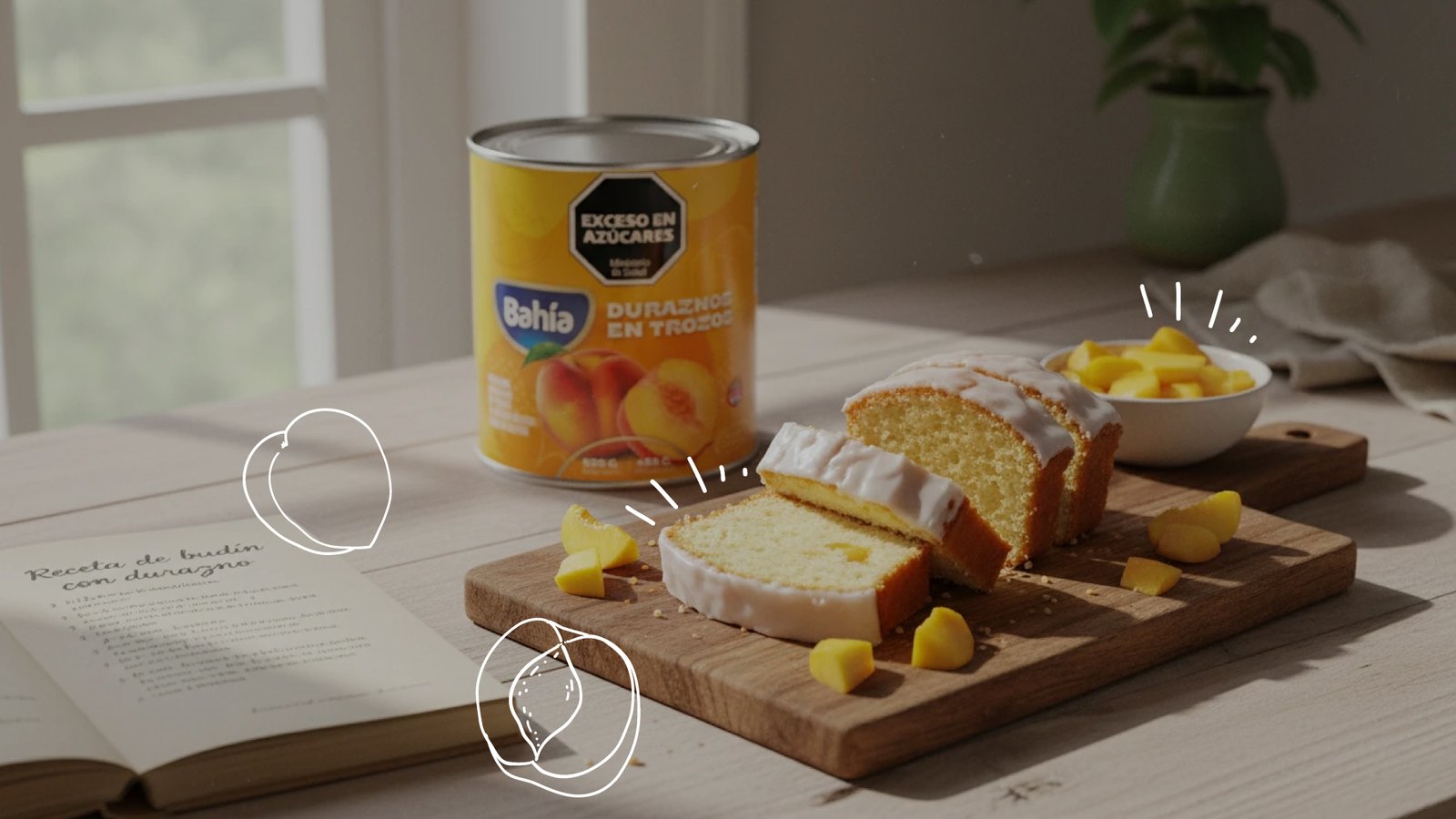Por último, agregá los duraznos, previamente escurridos y cortados en pequeños cubos. Volcá la preparación en la budinera enmantecada y enharinada y llevalo al horno por media hora aproximadamente.