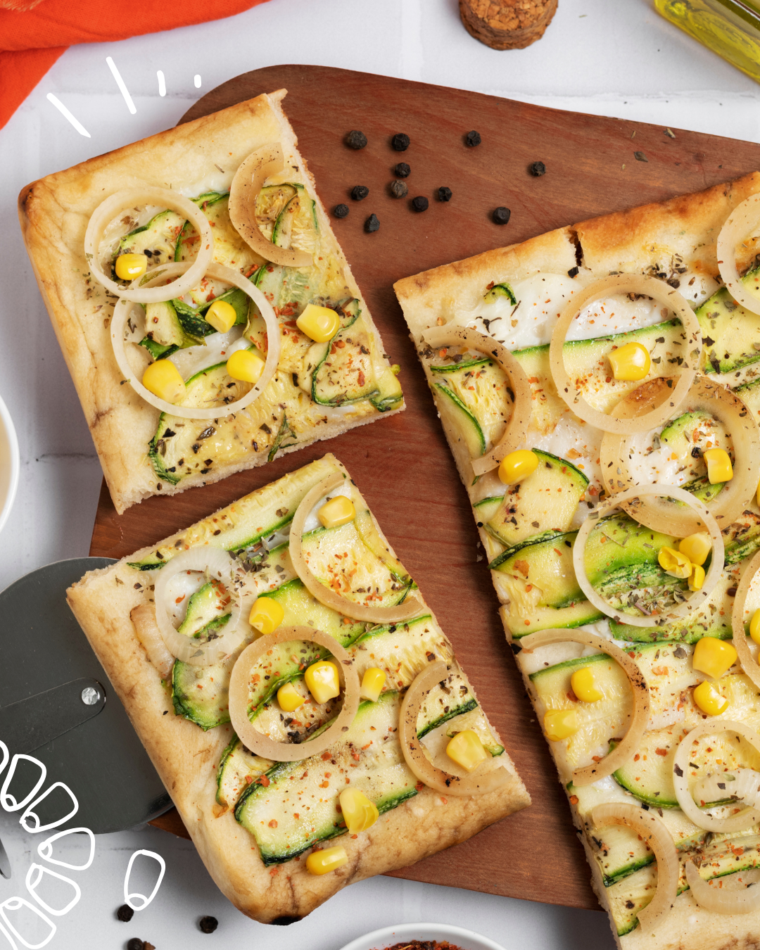 Estirá la masa sobre una placa aceitada. Hacé huequitos con los dedos y agregá el zucchini, la cebolla y el choclo Bahía.