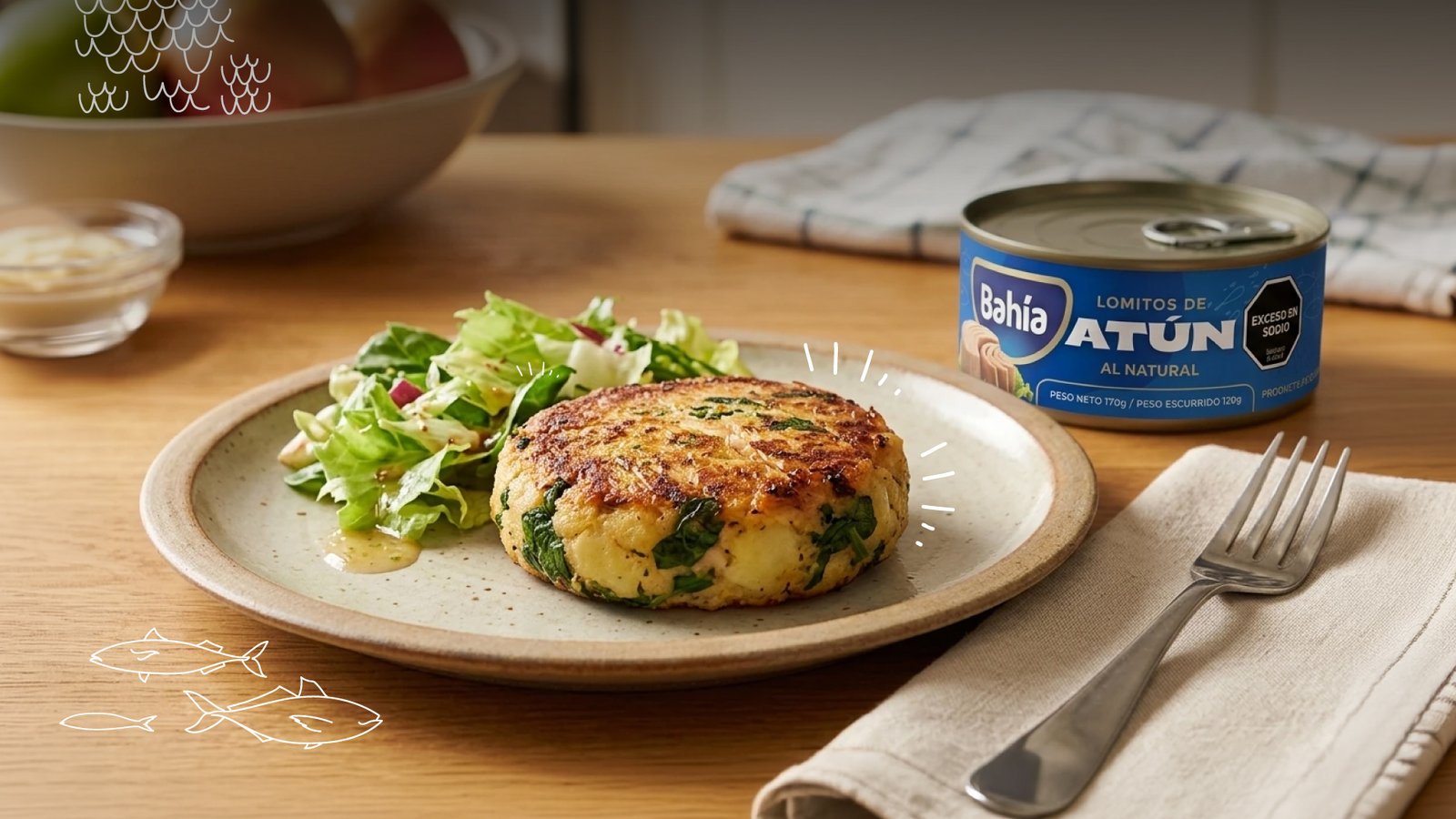 Lavá las papas y cocinalas con piel en agua con sal durante 20 min, hasta que estén tiernas. Escurrilas y dejá que se templen. Pelalas y aplastalas. Por otro lado, lavá las espinacas, secalas y picalas. Colocá los ingredientes anteriores en un bol, junto con las latas de atún Bahía y mezclá con una cuchara de madera.